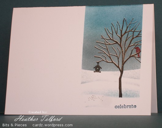 Posted: December 17, 2010 Filed under: Branch Out, CAS, Stamped Landscapes 5 CommentsOur family enjoys watching the birds feeding outside our kitchen window. In winter the seeds scatter on the snow and the cardinals, if they come, stand out: red against white. I added a little scattering of seeds in this scene with a brown marker.