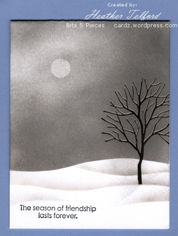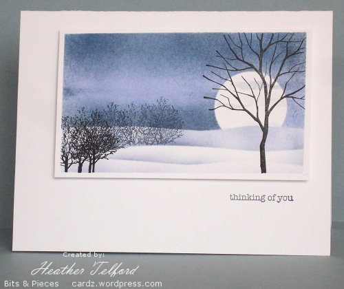 Posted: January 17, 2011 Filed under: Branch Out, CAS, Stamped Landscapes 13 CommentsYesterday I had a chance to create something for the One Layer Wednesday Challenge, hosted this week by Jennifer. The challenge is to use a bare tree, bare branch or other vegetation just as long as it is bare. That is not a hard ask for me as I have been happily stamping bare trees in snow for a month or so now. When I looked back through my recent posts I realized the tree from “Branch Out has been appearing often. I really think I need a few new trees stamps don’t you?