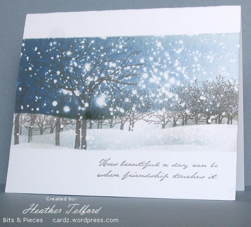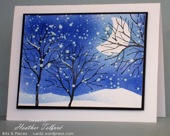Posted: February 19, 2011 Filed under: Branch Out, CAS, Stamped Landscapes 21 CommentsI came home and created this card last Sunday after walking my son down to the park to play hockey on the rink with his buddies. The snow was coming down very steadily and it was beautiful. I decided to try and recreate the scene on a card. I know spring might be showing its face in some places but I think we have a bit of winter to live through yet.