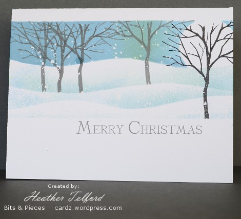 This card is my attempt to recreate the scene. I must say the scene was way more beautiful but it was fun to have a go. I masked the sides first and then stamped a row of trees in the background, the trees from Lovely as a Tree in the middle ground and the tree from Branch Out in the foreground. I embossed the black trees and then drew the snow on the branches with a versamarker before embossing a second time. I added the colour by sponging and masking.