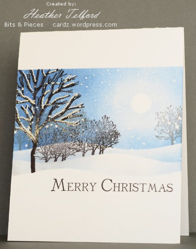 The card below suffered from a restamping of the foreground tree which didn’t really match up; I must have moved the positioning tool. To salvage it I used an embossing pen to draw snow on the branches but it is still a bit messy.