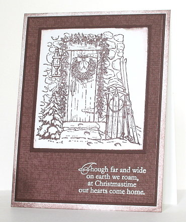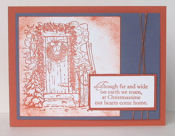 I think I qualify for Sharon’s challenge also, using a non-traditional Christmas stamp and non-traditional Christmas designer paper. I used Cerise Designer paper for this card, cutting out the little squares and placing brads in them for the detail down the side. I used Creative Memories oval cutters for the central image.