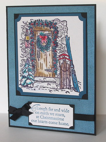 I stamped the picture with Basic Black and then used watercolour pencils for the colouring. It is hard to colour well on such a detailed picture. Then I picked out the colour of the skis for my mattes, one is Not quite Navy and the other is a co-ordinating piece of designer paper from way back when.
