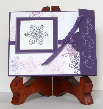 Once I decided my card would be a Christmas card a little sparkle seemed like a good idea. I started by stamping the snowflake in Elegant Eggplant and then embossing with irridescent ice. It sparkled a little but not enough so I stamped the versamark pad on the whole rectangle and embossed with irridescent ice again! Unfortunately the camera didn’t pick up the sparkliness very well. The “Season’s Greetings” is stamped in white and then embossed with irridescent ice also. The background is done with three colours of ink stamped and restamped to create different shades.