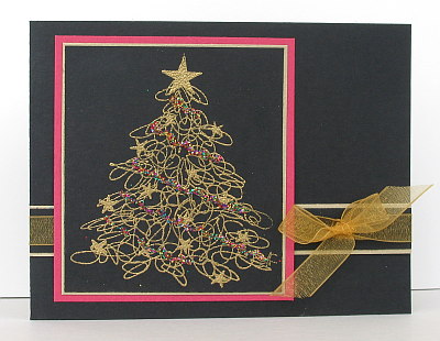 To make this card I stamped the tree and stars in versamark and embossed with gold embossing powder. I then drew lines for the tinsel using Sparkles diamond glue from Personal Stamp Exchange and sprinkled some fairly fine coloured glitter on the glue. As the glitter included bright pink flecks I matted with Rose Red as well as brushed gold. I would never have thought to make a black Christmas card but I quite like the black and gold combination.