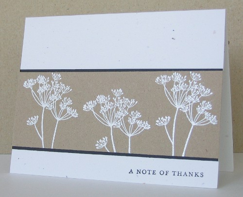 Posted: July 11, 2010 Filed under: CAS, Garden silhouettes 5 CommentsI had a chance to browse through the CAS favorites on Splicoast today and found loads of beautiful cards. I was inspired by Karen Dunbrook’s beautiful “white on Kraft” creation and ended up making a stack of Kraft cards, something new for me. Karen’s card was part of the CAS-tastic Krafty Kreations challenge so I will link mine over there also. I didn’t have any Kraft cardstock but found something similar in a promotional booklet from a paper company. I have a friend with a graphic design business who once gave me a stack of sample booklets from paper companies and they are full of interesting papers. I embossed in white and mounted it all on Confetti White which seems to work well with Kraft.