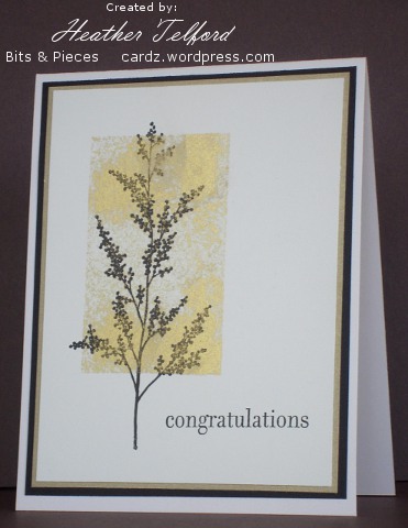 Posted: October 3, 2010 Filed under: CAS, Garden silhouettes 5 CommentsMy inspiration for this card came from AngelNorth. I wanted to make a simple but elegant engagement card for a friend who recently became engaged. She is a lovely girl who used to go to our church. Her mother still does and is a dear friend of mine so I plied her with questions regarding wedding plans. Her daughter does not want a big production wedding, she found the recent wedding show she attended absolutely overwhelming! I decide a little bit of nature and a touch of gold and black might be the right approach on a card.