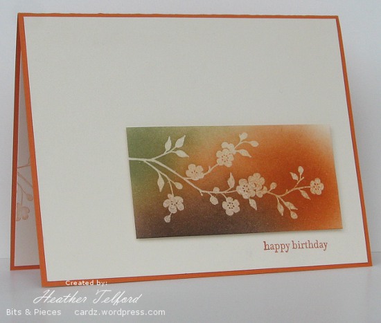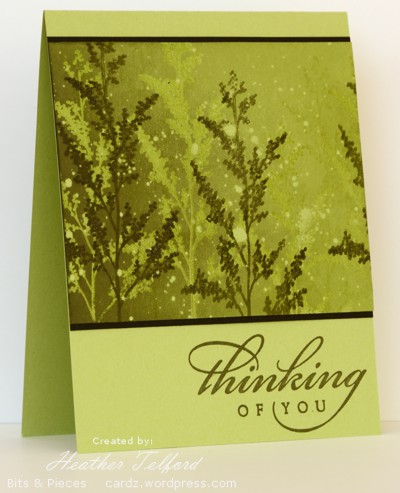 I delved into the CAS favorites thread at Splitcoast again for inspiration before making this card. I came across this lovely sponged panel card and wanted to create something just like it. I prefer Andrea’s beautiful scene with grasses to my silhouetted blossoms but I enjoyed creating something with a sponged panel over a sponged panel; most of my sponged cards lately have been one layer.