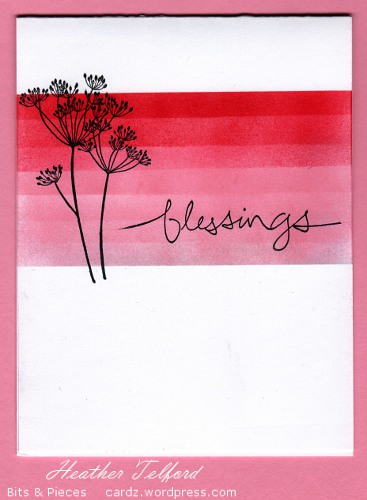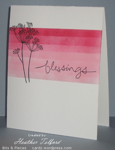 I used post it notes to mask and kept moving the bottom one up a little between spongings, changing from Pretty in Pink to Rose Red half way through. I stamped the Queen Anne’s Lace and the sentiment in black and extended the stems with a fine tip marker.