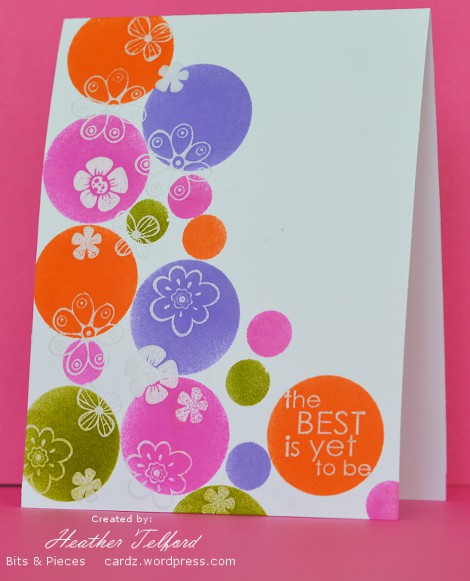The Less is More challenge for this week is to use circles. I had fun creating this card with plenty of circles sponged across it. I started by randomly stamping and embossing a bunch of little flowers from SU’s Itty Bitty Buds set. As they were embossed in clear they were not easily seen at this stage. To reveal them I sponged green, purple, orange and pink circles over the top. The fun part was watching parts of the flowers appear. The sponging was done through post-it notes masks made with circle punches.