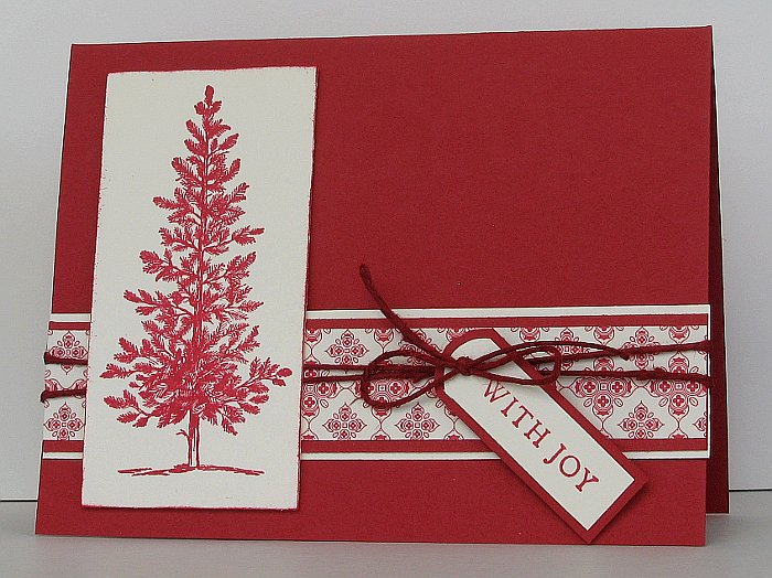 Posted: October 25, 2008 Filed under: Designer Paper, Lovely as a Tree 1 CommentI pulled out two old favourites for this card and combined them with a new favourite of mine, Riding Hood Red. Lovely as a Tree is definitely a favourite set of mine. I’m not sure where I read it but I believe it is the most popular set Stampin’ Up has ever had. I admit I don’t usually stamp it in red, but I wanted to use some of another old favourite, the Cerise designer paper from a year or so back. The patterns in this set of paper were perfect for making Christmas cards, the designs reminded me of Scandinavian embroidery.