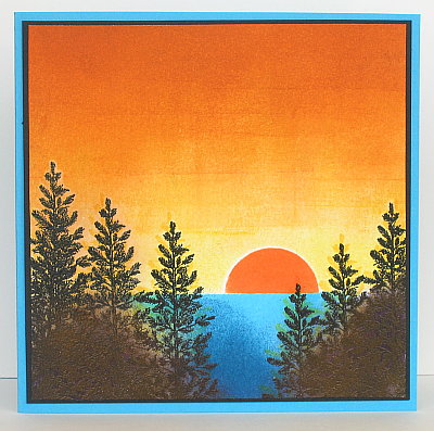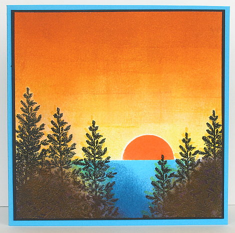 It was really a trial and error process creating this scene, I stamped the trees in yellow first and then versamark/black a little offset. This was an attempt to get the look of light coming through the trees. It looked odd so I decided to brayer it instead. I started with Summer Sun , then Apricot Appeal and finally Pumpkin Pie at the top. The only other time I had tried using my brayer on a card I had ended up with lines and patches, but I have been reading Michelle Zindorf“s tutorials ( can you tell!?!) and she said plenty of ink, over and over. I used a piece of paper to mask the lake area and a punched out circle for the sun. Originally the sun was pale yellow and looked almost white. Even though this is often what the sun looks like when it is rising it didn’t look right so I masked the sky and sea and sponged the sun in orange, the colour I’ve occasionally seen at sunset. The lake is sponged in Turquoise and Not quite Navy.