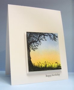 I embossed the tree in black and then sponged in yellow, apricot and blue to create the sunrise scene. I was going for the CAS look so I popped up the scene and stamped a greeting. Problem was I didn’t bother using the stampamajig for my words so they ended up crooked. To remedy that error I cut the picture off the white card I had attached it to leaving a narrow border of white around it. I then attached the two lavers to a new base and stamped the words again. So the picture is doubly popped up, which I don’t mind. The photo is a little strange as I took it on my craft table under the fluorescent light without the tripod. Time was of the essence.