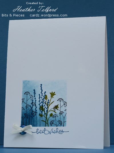 So the tiny little button and ribbon set the colour scheme for the card. I cut a square mask into a post-it note and used sponging in Not quite Navy to define the square before stamping the three Pocket Silhouette stamps.