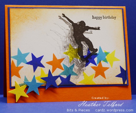 I punched a few stars out of a post-it note creating a stencil to sponge through in turquoise, brilliant blue, only orange and yoyo yellow. I was a Stampin’ Up demonstrator when there were four colour families plus the neutrals so I still think in terms of bold brights, rich regals, etc. My cardstock and stamp pads are still organized that way too as I do not own all the new colours or have a handle on the new “families” As you can see from this card the bold brights still work fine together. I stamped the skater in versafine and then restamped slightly to the left several times to create the effect of movement. To complete the card I sponged the perimeter of the white panel, matted in blue before attaching to an orange card base along with the three punched popped up stars.