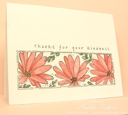 Posted: March 15, 2011 Filed under: CAS, With Gratitude 16 CommentsThe challenge at Less is More this week is a One Layer Card which includes stamping off the edge. I often stamp off the edge of my cards so you would think I could whip one of these out quickly. Sadly it took three attempts before I had something I was happy with. I have a growing pile of “blunders” that I have to turn into something attractive.