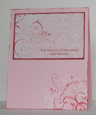 Posted: October 2, 2008 Filed under: Season of Friendship, Uncategorized 1 CommentThe inspiration for this card was a card made by Sharyn Tormanen on page 64 of the August/September edition of Papercrafts magazine. Once again a simple but striking card caught my eye. The red flourishes were stamped with the gorgeous flourish from Baroque Motifs and the white flourishes are rub-ons from the retired Cherished Memories set.