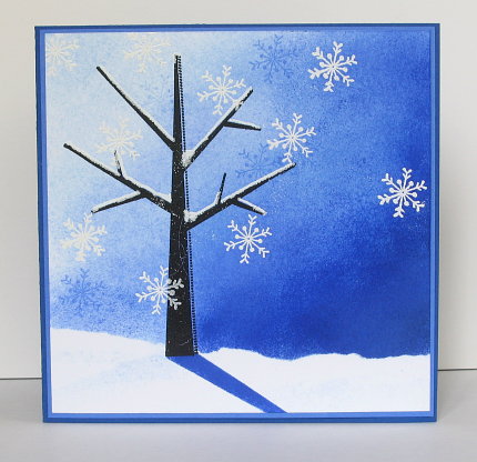 I have spent a bit of time lately browsing through the wonderful artwork of Michelle Zindorf and was inspired to try a scene complete with shadows and heavily sponged skies. To make this card I stamped the tree in versamark and embossed with black embossing powder. I then stamped the snowflakes in versamark and drew snow on the branches with the versmarker before embossing again, this time with white e.p. To make the tree’s shadow I inked the trunk with Brilliant Blue and stamped it at an angle, using a little scrap of paper near the base to mask any area I didn’t want stamped.