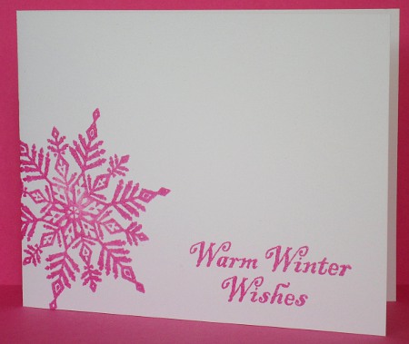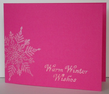Posted: August 17, 2010 Filed under: CAS, Snowflakes 1 CommentSusan’s latest One Layer Wednesday challenge is to use an unexpected color scheme for a card. It doesn’t get much more unexpected than making pink snowflake Christmas cards. I didn’t really want to make pink Christmas cards, it just didn’t sit right with me! But I persevered and think I might even know who I’ll give these pink cards to. My camera didn’t really pick it up but both cards are embossed with iridescent ice e.p. for a little snowy sparkle.