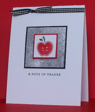 Posted: March 13, 2010 Filed under: Tart and Tangy 2 CommentsWhile playing with the Tart and Tangy set last weekend I also came up with this card. I love the look of red, white and black together so a little red apple combined with black and white gingham was a happy combo for me.
