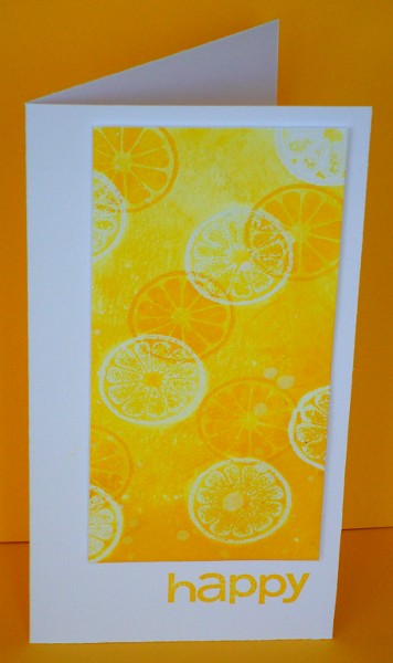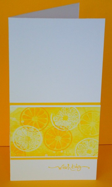 I have decided that it is possible to forget how to stamp, how to make cards, how to put things together so they look ok! I made three CAS cards, and it took me hours. As Lateblossom has said before, “Clean and simple does not always mean quick and simple.” I stamped the citrus shapes four or five time before I settled on three colours in a row. I tried ribbon in many different arrangements before I decided on no ribbon at all. I tried a green card, white matte. White card, no matte. Green card, green matte. Just as well my daughter came home when she did and made the decision for me. Then there was the decision over the sentiment…
