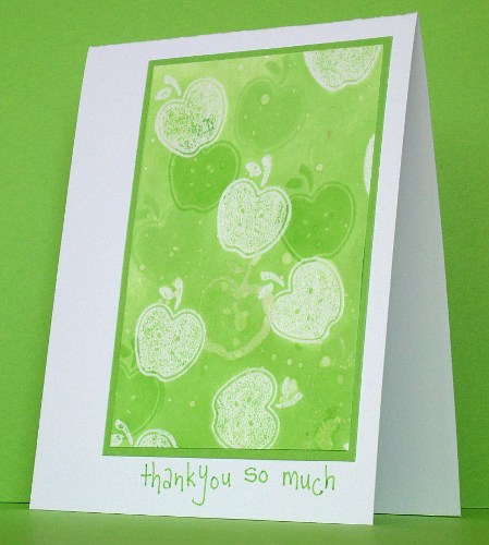 Posted: July 29, 2010 Filed under: Tart and Tangy Leave a commentI used the same technique as the lemon cards: emboss, brayer, stamp in the same ink as the brayer and water droplets. I added another step on this card and stamped the apple in water; the ghost of an apple in the centre was stamped in water. The sentiment is handwritten. I did try the strawberries from this set with this technique but it is really a monochrome technique and the strawberries were not happy with that. The cherries didn’t like it either, but I am happy with the lemons and apples. I guess I could keep going and do oranges, limes and red apples if I really wanted to!