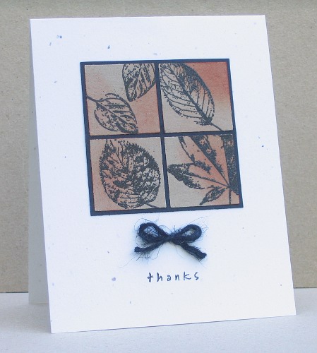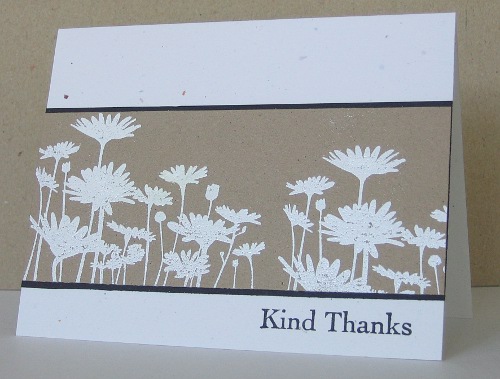 Posted: July 15, 2010 Filed under: CAS, Upsy Daisy, With Gratitude Leave a commentI mentioned the other day that the CAS-tastic challenge to use Kraft had inspired me to create a bunch of cards. I decided to make them all thank you cards and perhaps box them up in a set to use as a gift. This is the second one I made using white on Kraft again and the same layout. I stamped the daisy stamp twice to fill the space.