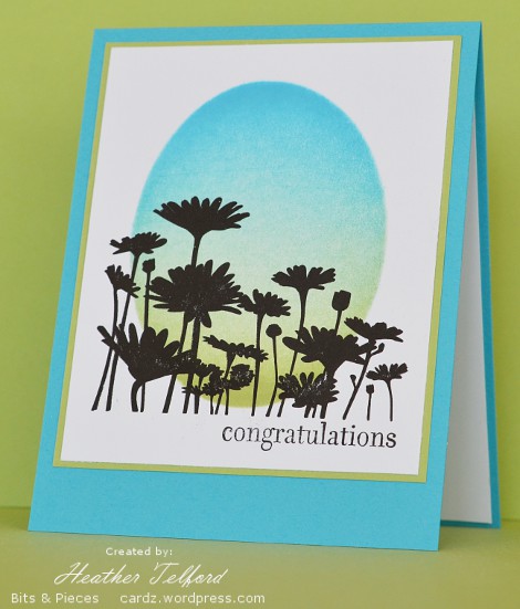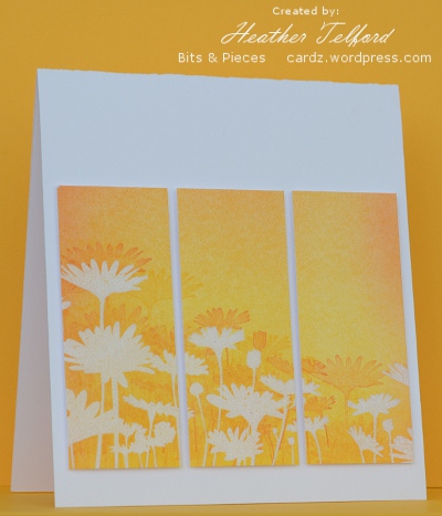 Posted: February 26, 2011 Filed under: CAS, Upsy Daisy 5 CommentsHere is another spring inspired card using the daisy silhouette stamp from Stampin Up. I clear embossed the daisies then brayered the whole panel with summer sun and and pumpkin pie. Before splitting the panel into three I stamped and restamped the daisy stamp in pumpkin pie. Each panel is popped up on stampin’ dimensionals.