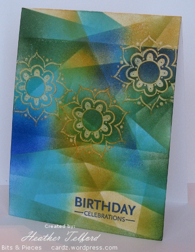 The inspiration for this card came from my daughter’s violin teacher. She was wearing a top the other day with these colours and flowers printed in a batik style. I stamped the flowers in versamark and mustard so I could emboss them in clear. I then began to sponge in turquoise, garden green, brilliant blue and mustard. I moved a post-it note around to create criss cross patterns of colour which, now that it is finished, remind me of light coming through stain glass windows.