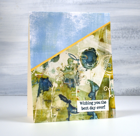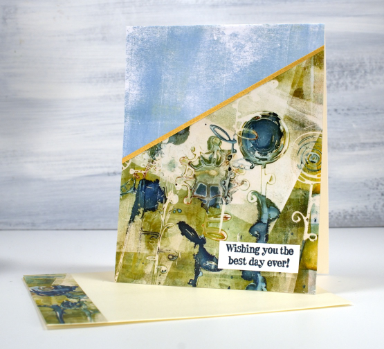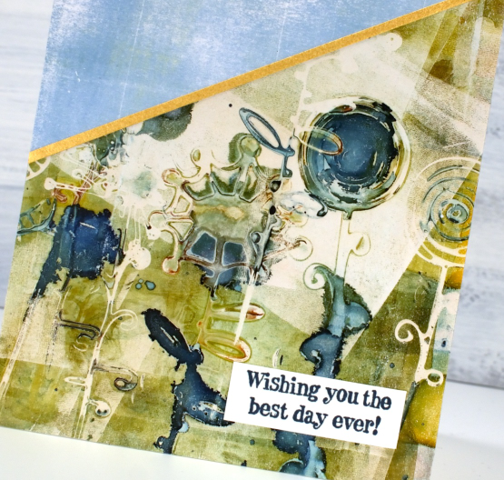 The second card was also made using alcohol inks on the gel plate but is a more grungy print due to the mix of green and cream paint used to pull the print and the mix of yellow, green and blue alcohol inks used to make the pattern on the gel plate.