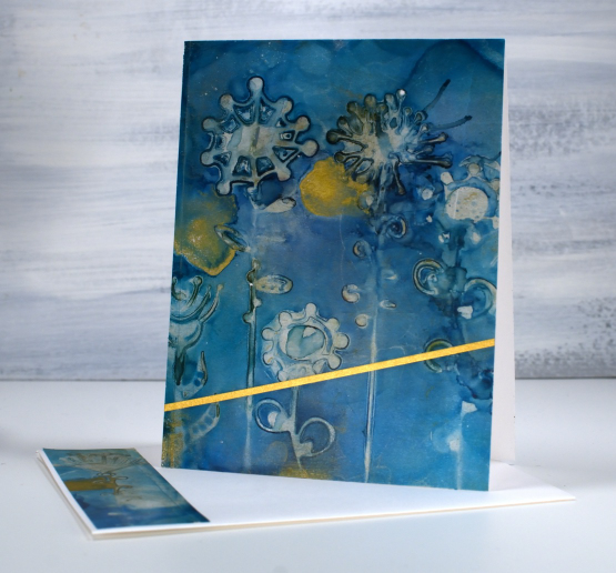 When fresh flowers for gel printing are not readily available, there are always the die-cut ones. In making today’s cards I gel printed patterns using die-cut flowers and leaves and a mix of blue, green and white paints.