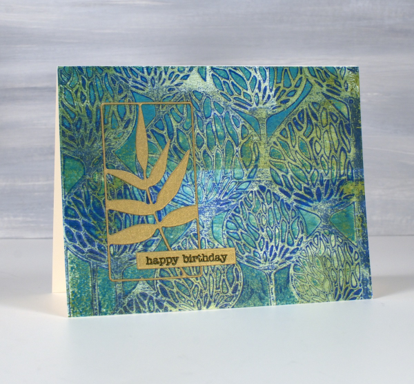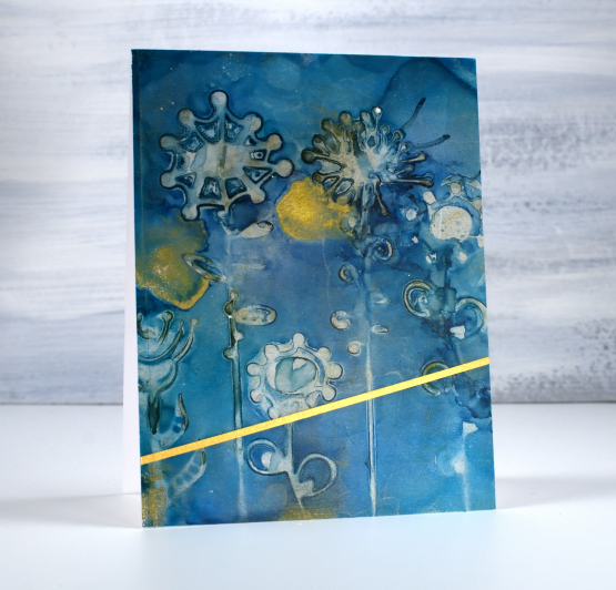 If you are a fan of Lavinia stencils like I am you probably recognise the ‘Pods’ stencil used for this print. I printed on a 6″x 6″ gel plate giving me a print big enough for two cards. It’s hard to see in the photo but some of the paint was metallic so the print has some shimmer and shine on it.