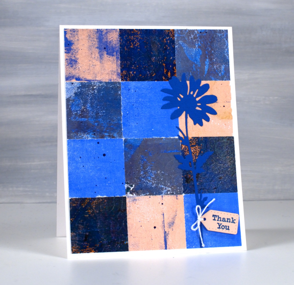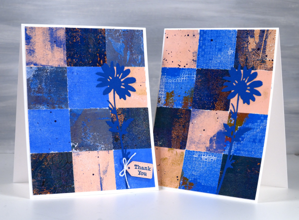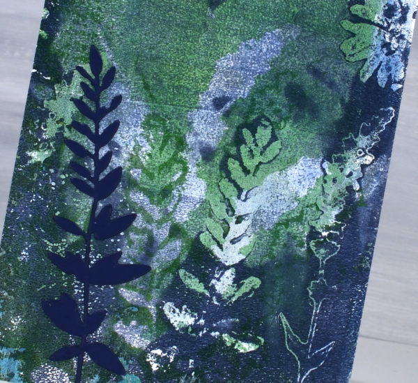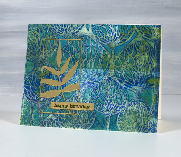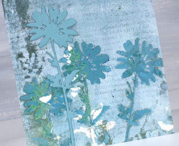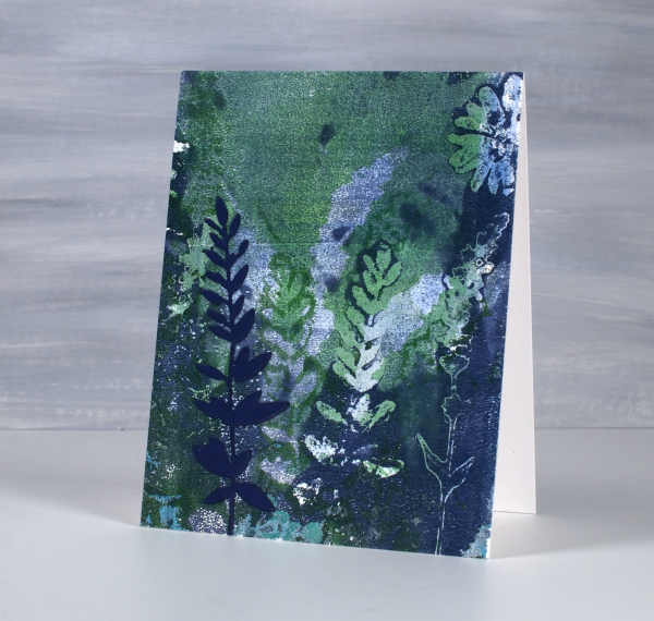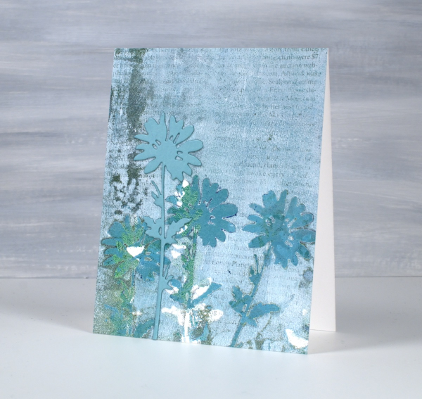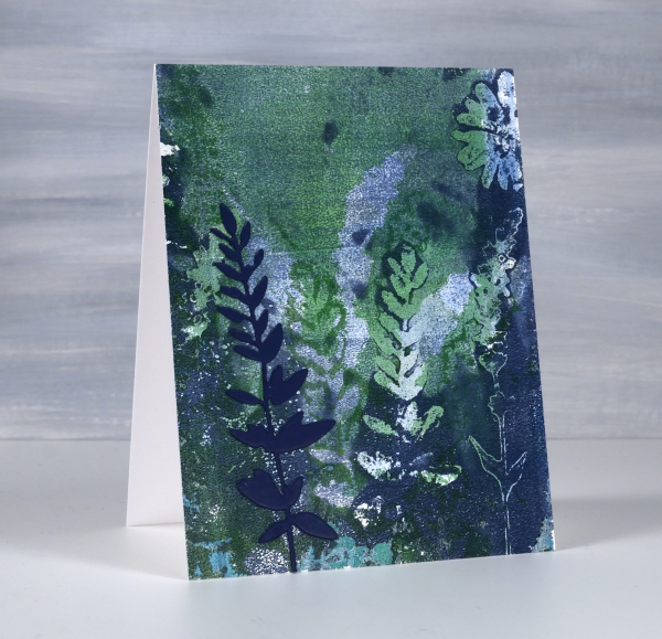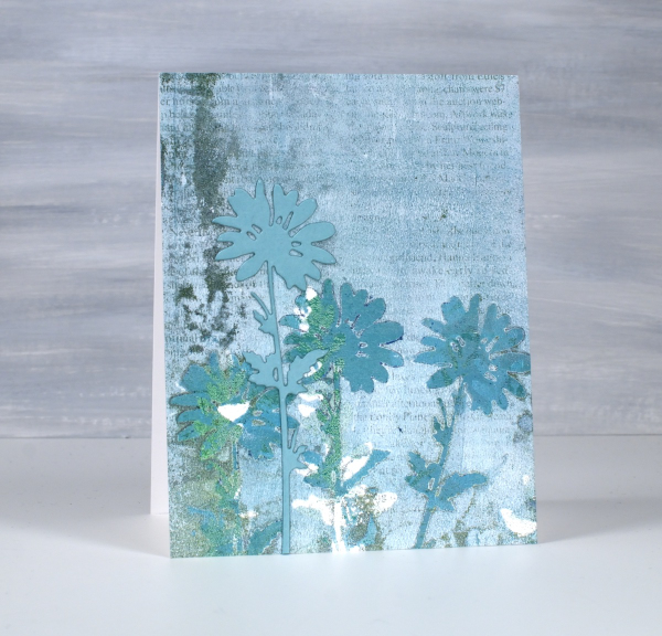 You can see when comparing these two cards the impact of adding some white paint to the mix. I used the same blue and green acrylic paints for both panels but the one above was toned down with white brayered onto the gel plate with the green and blue. So while you to print fresh flowers, die-cut yourself some from paper or duralar and see what you can come up with.