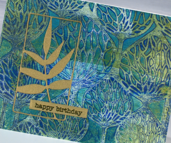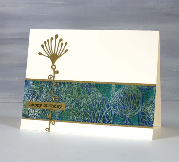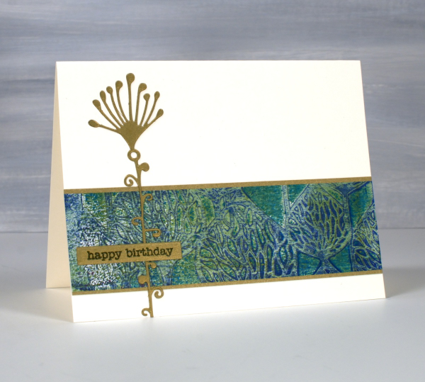 Rather than use the whole panel I added a simple blue gel printed piece to the top of the card front and once again a gold strip of cardstock. The sentiment is from the Darkroom Door happy birthday set.