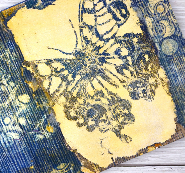 The butterfly print was on paper but the circle and stripe print was on tissue and was fairly fragile. I was able to glue most of it down successfully with gel medium but I don’t mind the ragged edges where it tore. This post includes affiliate links from Foiled Fox and Scrap’n’Stamp . If you buy through these links I receive a small commission at no extra cost to you.