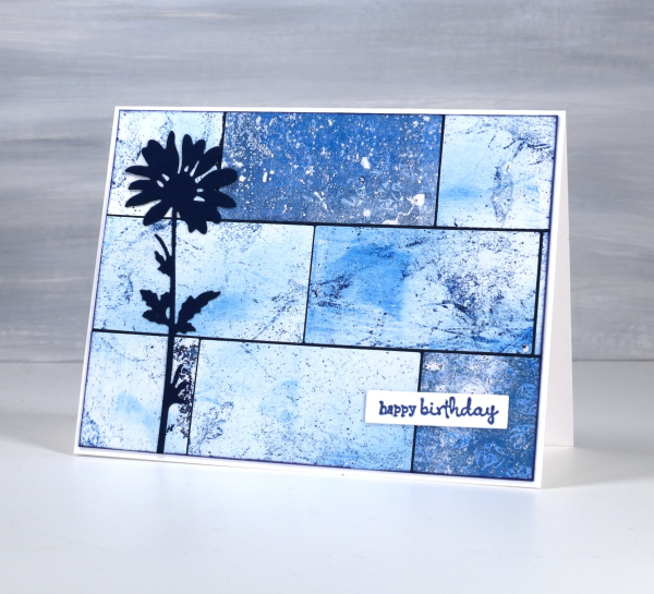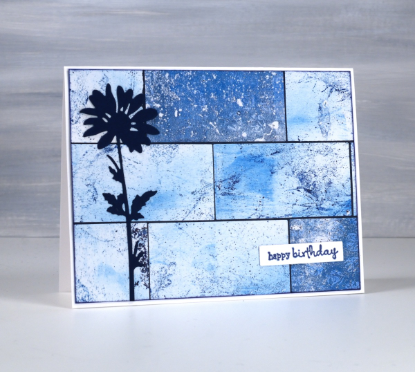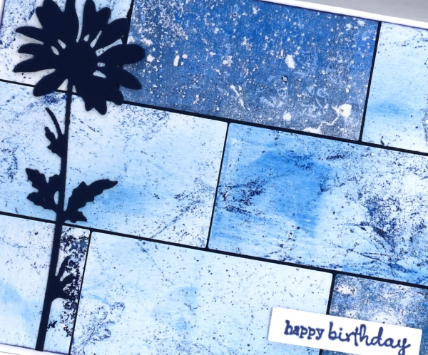 I used three different gel prints to ’tile’ the card above, a plain blue print, a print created with a zig-zag stencil and a print made with the an impression from an embossing folder. To tie together the dark blue, light blue and yellow + blue prints I added a navy wildflower (Tim Holtz) and navy ink splatter.