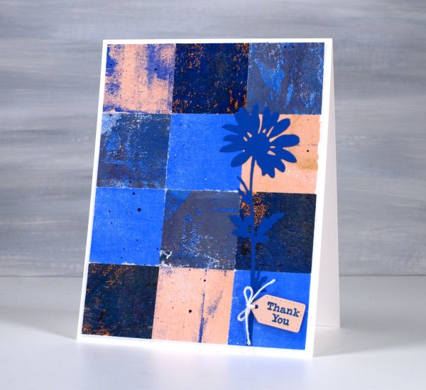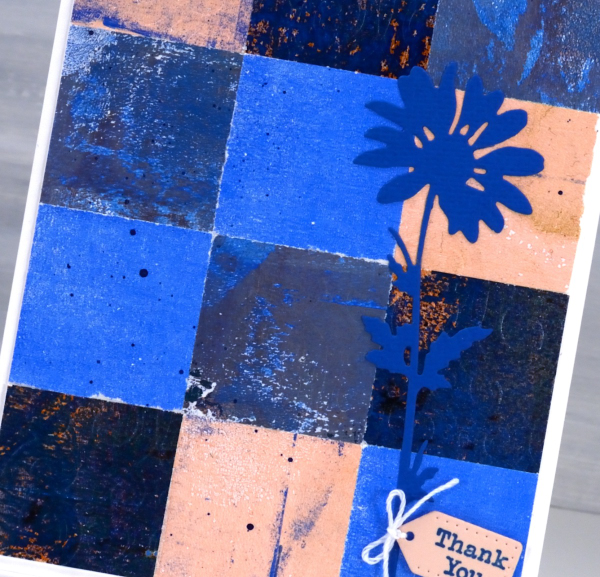 I have many of my gel prints sorted by colour so I pulled several 6 x 6 prints from the blue folder and used them on a few different cards. I also had green, yellow and gold toned prints on hand to make some multicoloured cards; I’ll share them another day. To create this card I cut the blue gel prints with a rectangle die then arranged them like tiles over a navy background before trimming end to fit.