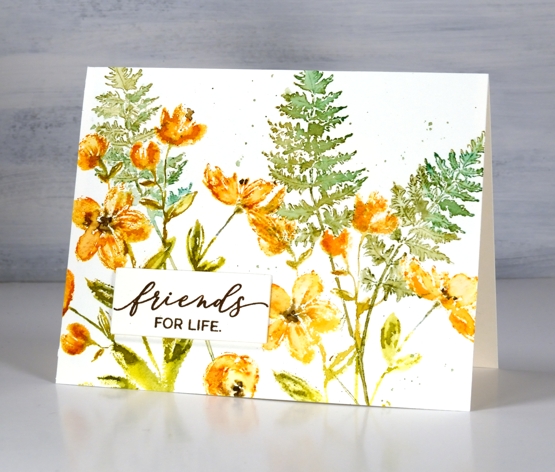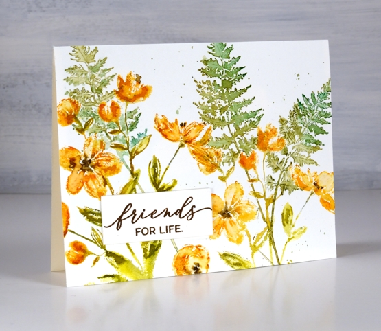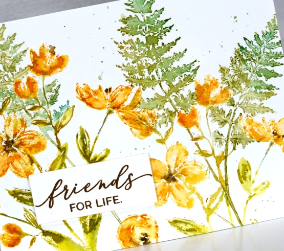 Once I’ve stamped the images I decide whether to blend further with a paint brush and water, for this card I kept it minimal but sometimes I do more blending for a looser watery look. I stamped the ferns after the flowers which required some partial stamping and as well as a little masking to make the ferns appear to be behind.