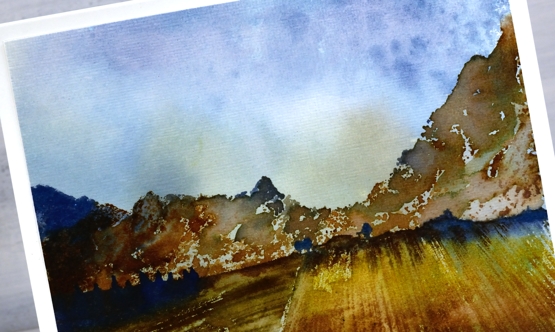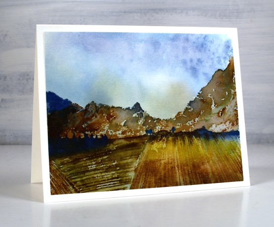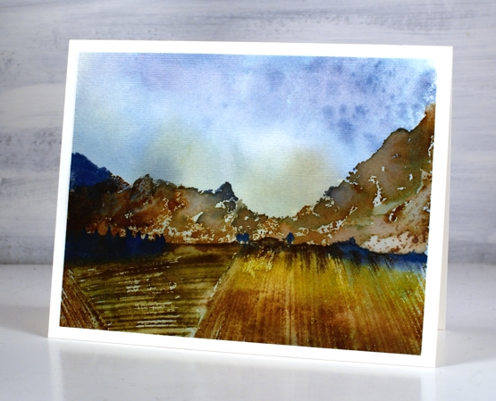 Once the background was dry I inked the mountains in vintage photo, faded jeans and ground espresso inks taking care not to ink to the bottom of the stamp but instead leaving the lower edge unevenly inked. I did some blending with a paintbrush after stamping to make the mountains less defined.