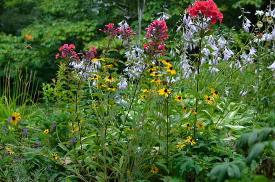 Floral inspiration today but not the stamped and painted kind. I thought I would give you a glimpse of my backyard garden. I am not a knowledgeable or careful gardener but after years of working and learning the half circle garden is thriving and blooming.