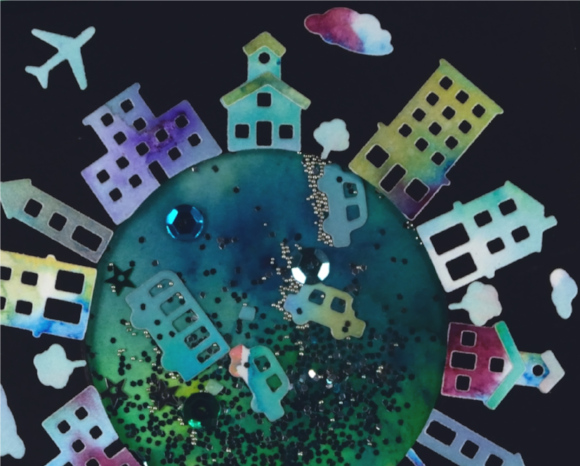 I have more watercolour die cuts to share. This card has a much higher fiddliness factor than the previous ones and has convinced me that I should never video myself making a shaker card! Rather than trying to describe my trial and error process for making this shaker card I will just list the layers I used from little die cuts right down to the card base. The mini community and ‘the world’ were cut from brusho panels.