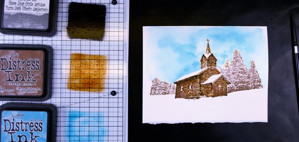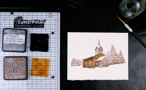 When blending the vintage photo ink I dabbed with a damp paintbrush instead of blending. I didn’t want the ink to cover the walls of the church uniformly, instead I left areas white and added black for shadows wherever I thought there would be some.