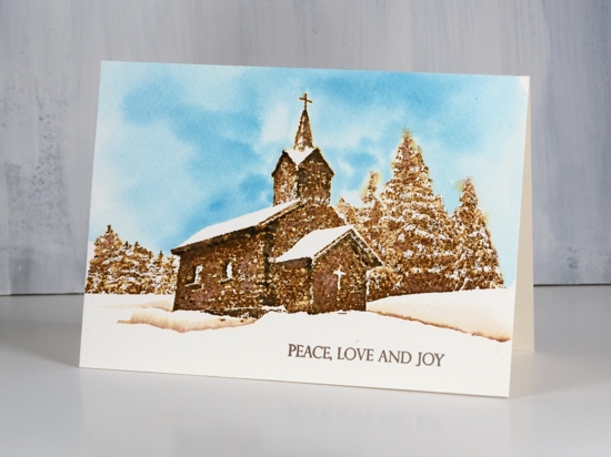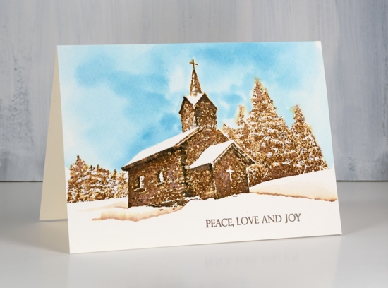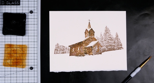 I blended water over the stamped sections of trees taking care to leave the white areas to look like snow.