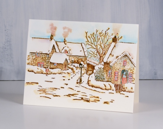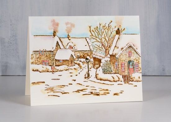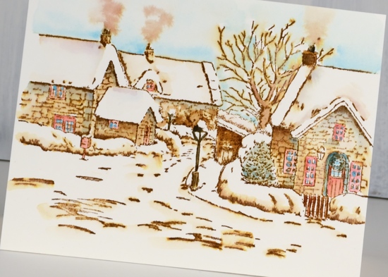 Posted: August 20, 2018 Filed under: Stamped Landscapes, tranquil hamlet, Watercolour | Tags: Faber-Castell Albrecht Durer Watercolour pencils, Penny Black stamps, Ranger Distress inks 7 CommentsYou’ve probably heard by now there is a new Penny Black release in town! Two actually, a big beautiful Christmas release and a fun fall release. The catalogues can be viewed here. I’ll be featuring vintage style snowy scenes all week here on the blog even though the sun is shining and the grass is green outside!