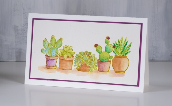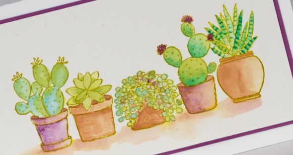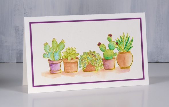 I stamped the image from the PB ‘happy together’ set in crushed olive distress ink then used a paint brush with my watercolour pencils to add colour. I painted shadows in a mix of brown and purple then matted with some purple cardstock.