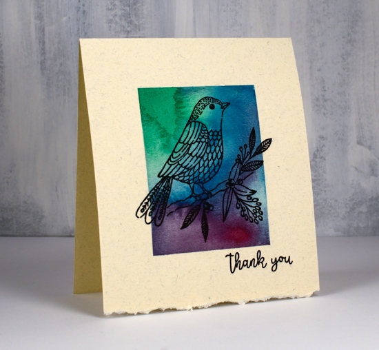 I stamped the new line art stamps from Penny Black with Ranger archival inks and was very happy with the crisp prints on the paper, I thought there might be a bit of bleed as the paper has quite a soft surface but the stamping was crisp and there was no bleed through with the watercolour washes. For the two cards above I simply stamped the image over the watercoloured section. On the card below I did the same then added some extra painting to the flowers using the same paint colours. The colour of the paper makes the paint colours more muted than they would be on white or cream but I liked the more rustic simple style on these cards. You could definitely use this technique with the traditional white watercolour paper and achieve much brighter results.