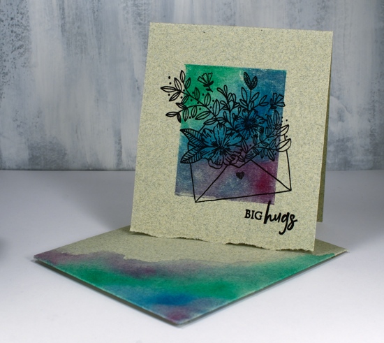 These cards are one layer making use of the natural deckled edge on one edge of the paper pad. I scored the paper then taped it to my glass mat, lining up the frog tape with the grid on my mat to create a masked panel in the centre of the card front. I used three colours of paint on each card and matching envelopes. I was impressed that no paint seeped under the edge of the tape so I had crisp edges to my watercolour panels.