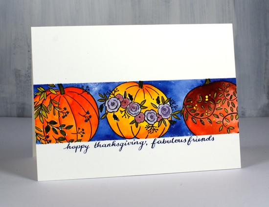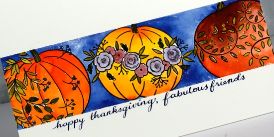 After all the pumpkin decorating, I painted the background with ultramarine. If you have masked with tape before you will know how satisfying it can be to peel back the tape to reveal crisp straight edges and also how frustrating when some paint has seeped underneath. Well, again, wonder of wonders, no seepage! Now, the last wonder of wonders is really the biggest. I occasionally do my own calligraphy sentiments, more often than not it does not end up straight, neat or the right size so I end up cutting the painted panel off and attaching it to a whole new panel in order to get rid of the messed up sentiment. This time I ruled my pencil lines, practiced the sentiment on a scrap, wrote it in pencil on the panel and finally wrote it with pointed pen in a mix of ultramarine and pearlescent ink. The next step was key; I have messed it up in the past. I left the room and went and had my lunch, that way I was not tempted to erase the pencil before the writing was dry, dry dry! I used one of those nifty battery operated erasers to gently erase all the pencil and then did a happy dance!