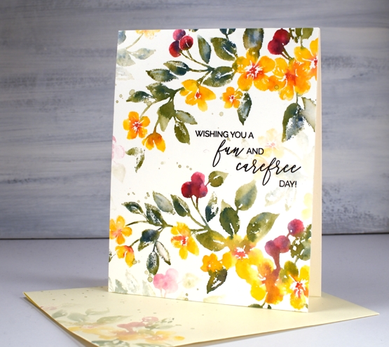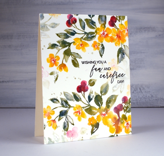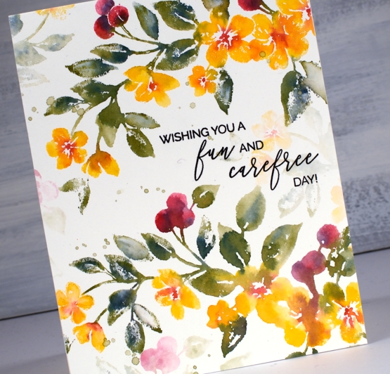 You probably noticed in the video the way the brush pen bristles were able to easily get into small sections of the stamp so I could ink the flowers, berries and leaves. I spritzed the stamp before pressing onto the hot pressed watercolour paper so the inks would blend on the stamp rather than me blending them on the paper. I love the softness of the blends including the areas that get more water and the ones that look a little dry because they got less water.