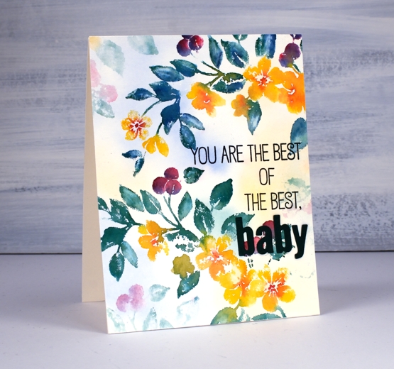 The card below was done with the same stamping technique but I created the soft coloured background at the beginning of my process. I scribbled the blue, yellow and green pens on my glass mat first, spritzed with water then swiped the hot pressed watercolour panel through the ink picking up sections of diluted colour which I dried before transferring the panel to my stamp positioner to do all the flowers. If you are wondering about the sentiment, it is for one of my friends who was told this by a student! When she relayed the experience to me I knew it had to become a card. I did a bit of partial stamping with MFT ‘birdie brown greeting stamps’ then cut the letters b, a, b, y from dark green cardstock (I know it looks black ) with MFT ‘little lowercase dies’.